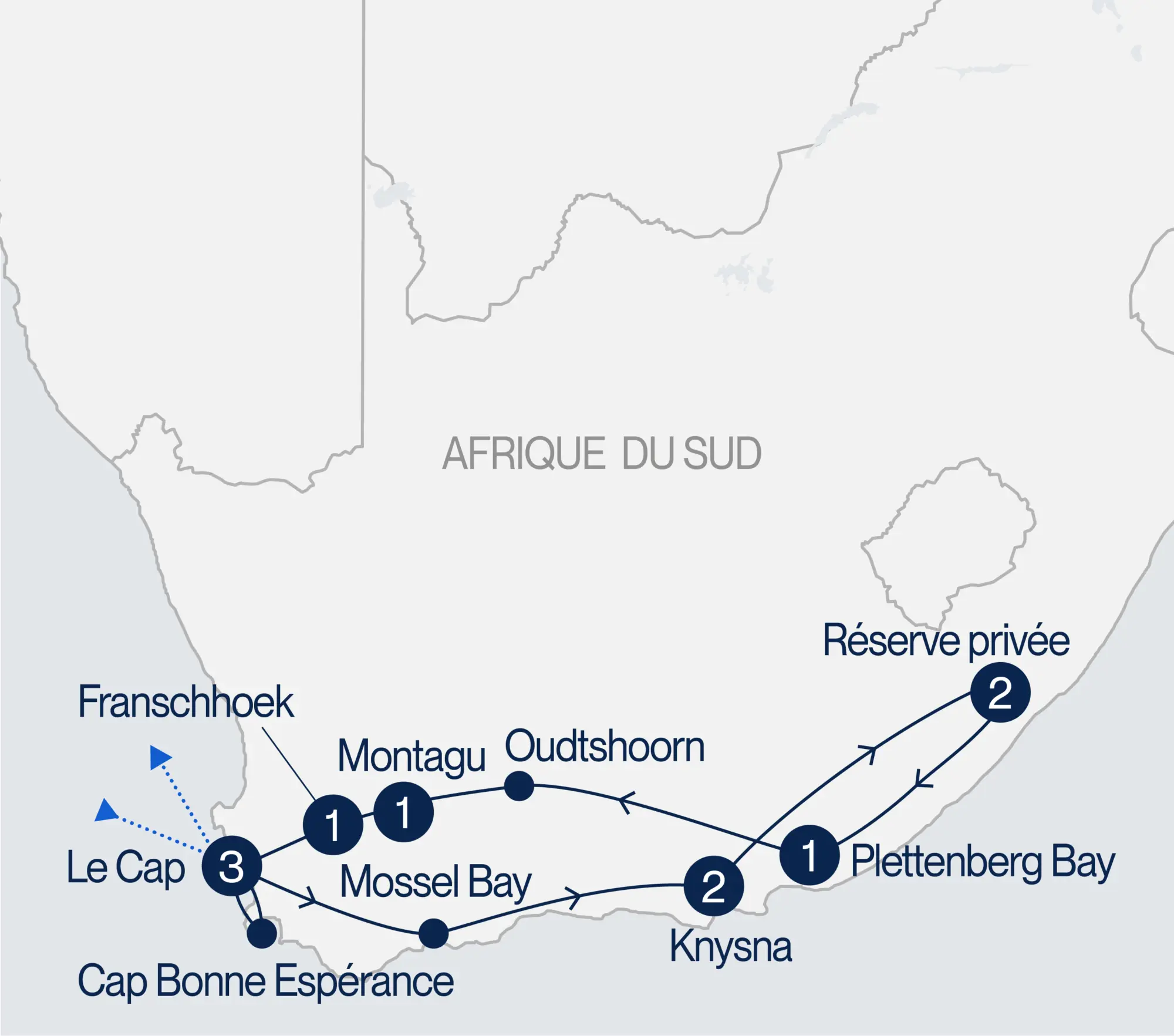 Matinée libre pour visiter la charmante ville de Franschhoek à votre rythme. Route vers Le Cap via la ville historique de Stellenbosch, seconde plus ancienne ville du pays et centre viticole et universitaire. Transfert à l’aéroport du Cap. (DJ)