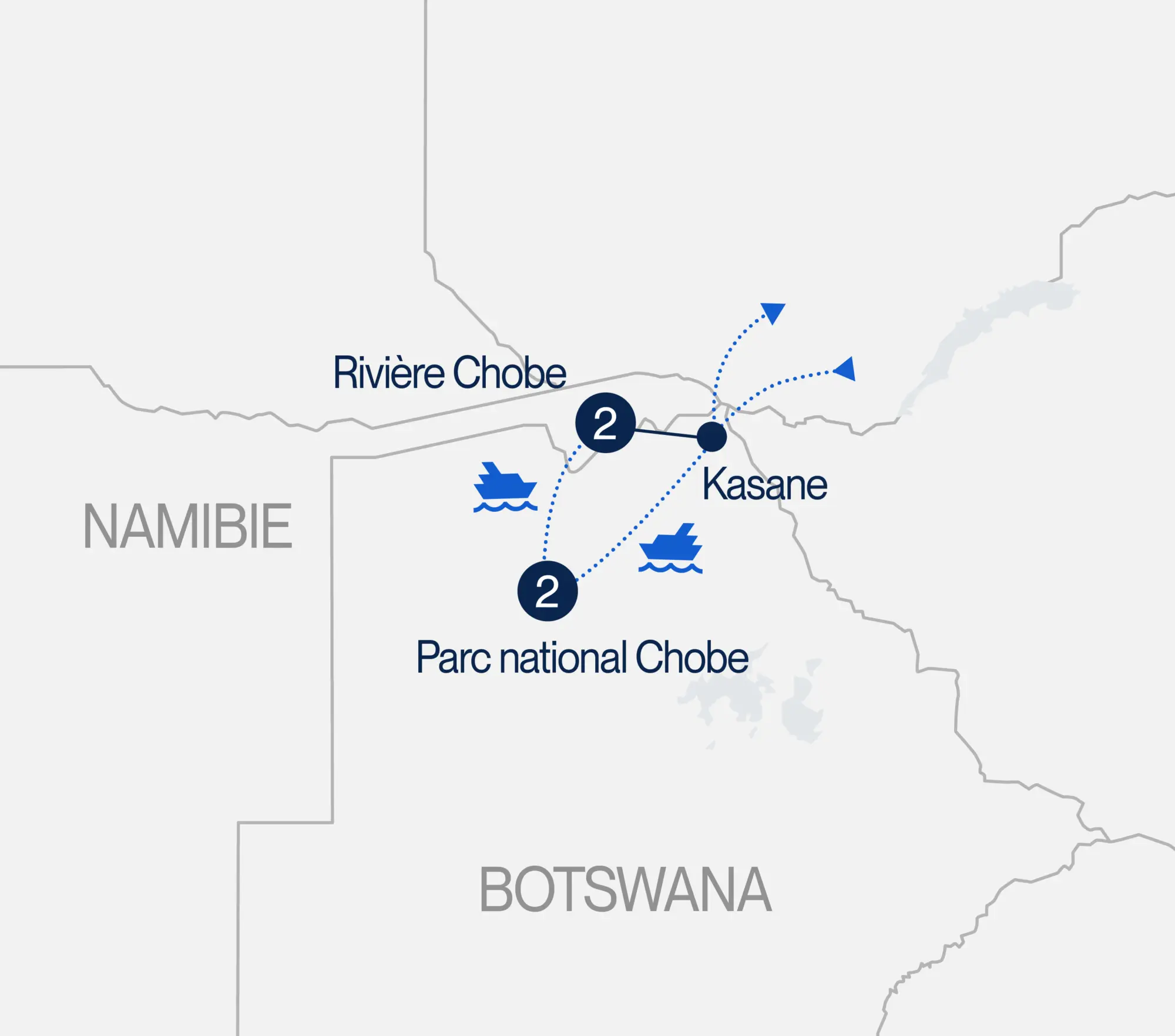 Déjeuner léger. Safari-photo matinal (si le temps le permet). Transfert en bateau puis en véhicule vers l’aéroport de Kasane. (DJ)
