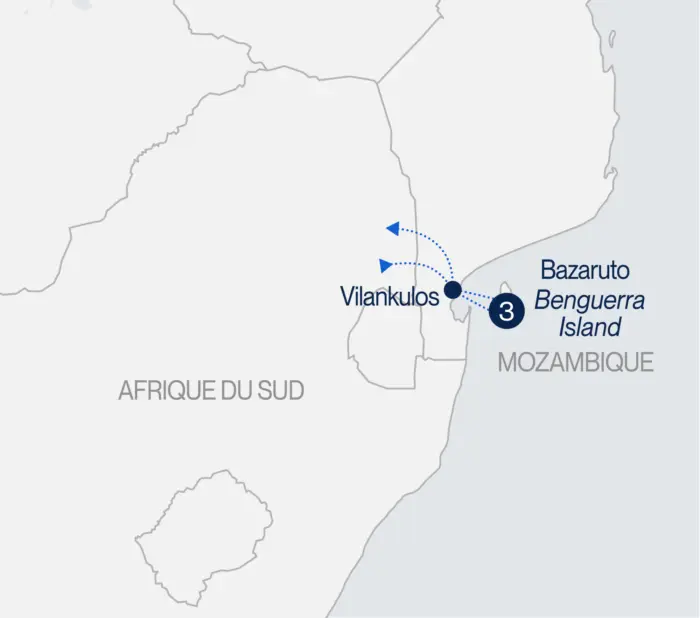 Accueil à l’aéroport de Vilanculos par un représentant anglophone. Transfert en hélicoptère directement au Azura Benguerra Island situé dans l’archipel Bazaruto (durée 10 minutes). Installation pour 3 nuits. Souper. (S)