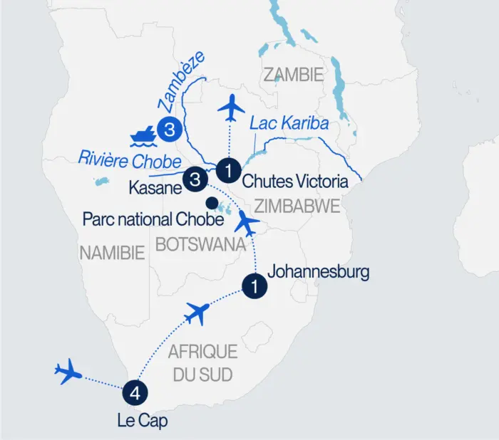 Votre aventure en Afrique australe débute sur la péninsule du Cap, entre sites historiques classés à l’UNESCO, panoramas spectaculaires depuis la Montagne de la Table et Chapman’s Peak Drive, et la rencontre des manchots de Simon’s Town. De Johannesburg aux majestueuses chutes Victoria, découvrez des paysages grandioses, l’héritage de Nelson Mandela, une faune exceptionnelle au coeur de réserves naturelles renommées, une gastronomie raffinée et les mystères du lac Kariba.