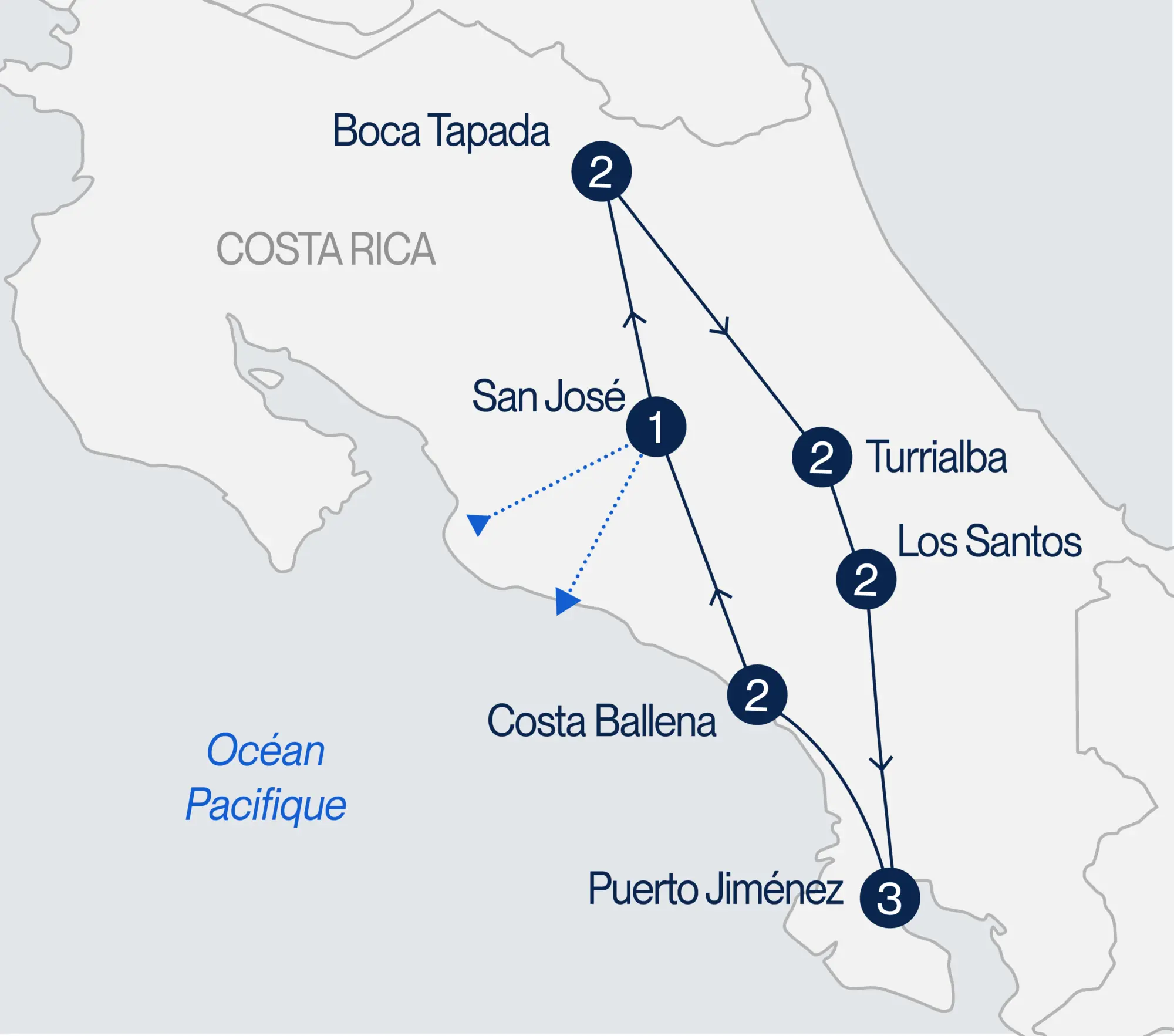Arrivée à San José et transfert privé à votre hôtel. Une fois bien installé, vous recevrez un appel téléphonique d’un représentant local francophone qui vous fournira les informations nécessaires ainsi que les derniers conseils à savoir pour profiter pleinement de vos vacances.