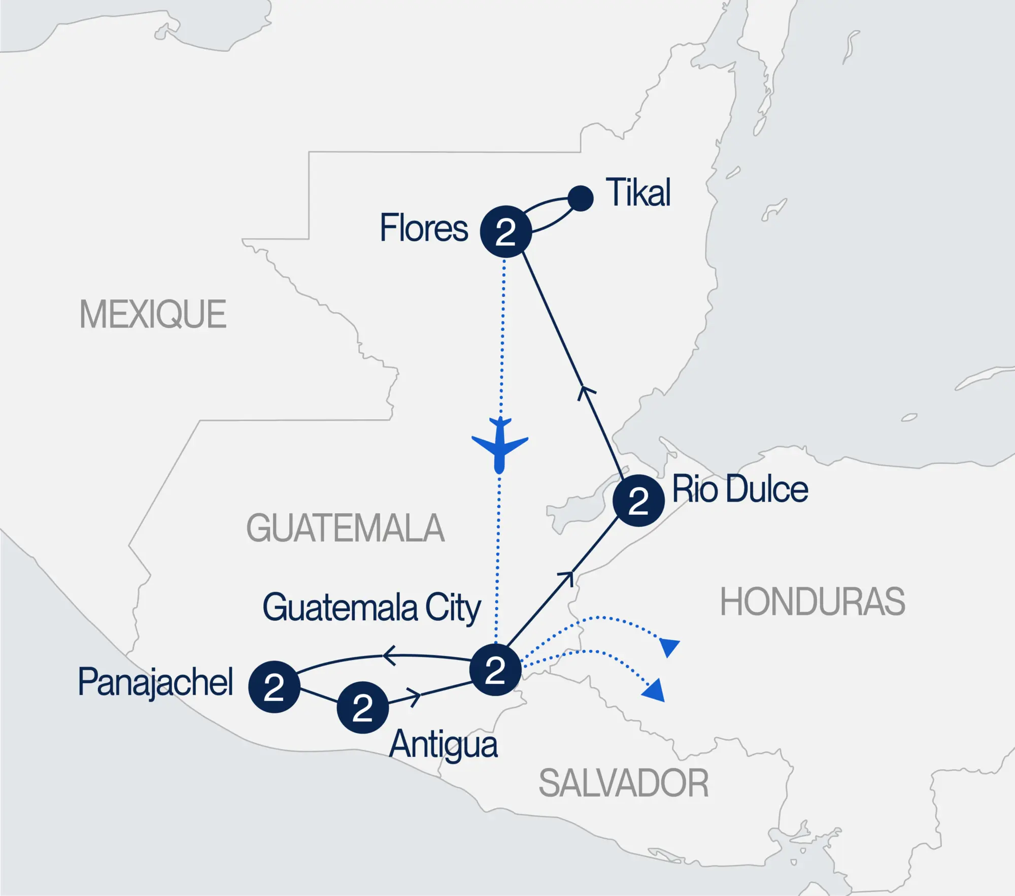 Route vers le parc national de Tikal, seul site au monde à être considéré à la fois patrimoine mondial culturel et naturel par l’UNESCO. Visite du site. Dîner à la plancha au coeur de la jungle. Tikal est l’un des sites majeurs de la civilisationmaya considéré comme l’un des plus beaux d’Amérique centrale. Départ pour une promenade en bateau sur le lac Petén Itzá pour visiter le petit musée d’archéologie maya situé sur un îlot du lac. Souper chez une famille pour déguster les plats typiques de la région et participer au « loto guatémaltèque ». Retour à Flores. (DJ, DN, S)