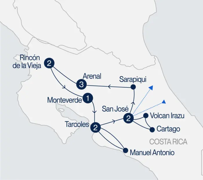Arrivée à San José. Accueil par votre guide francophone puis transfert à votre hôtel.