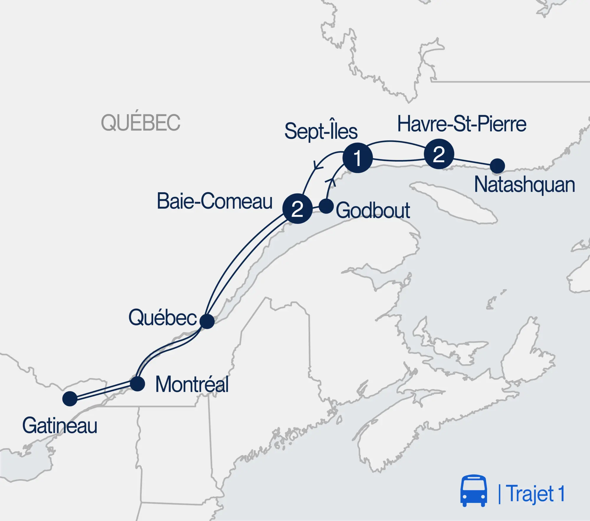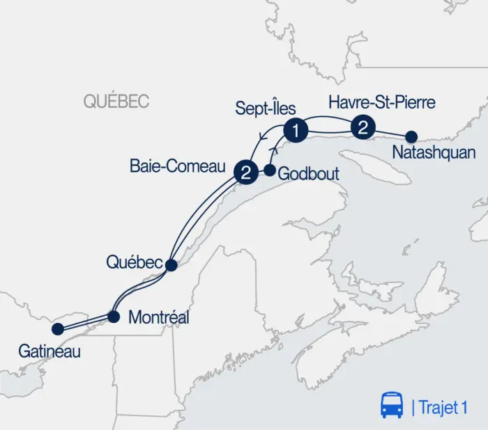 Départ de Gatineau via Montréal et Québec, en direction de Baie-Comeau. Arrêt pour le dîner. Installation à l’hôtel pour la nuit à Baie-Comeau.