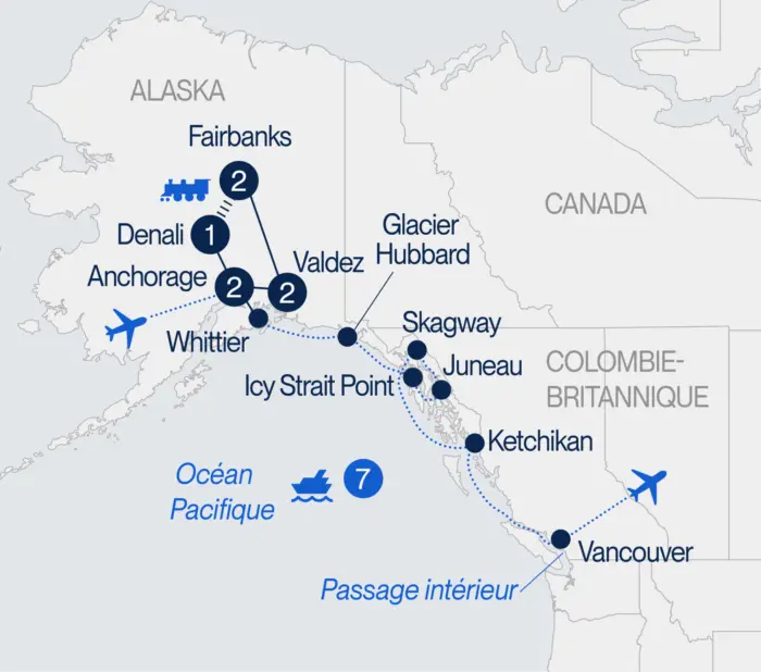 Arrivée à 07h00. Petit déjeuner à bord. Débarquement et transfert vers l’aéroport de Vancouver pour y prendre votre vol vers Montréal. (PD)