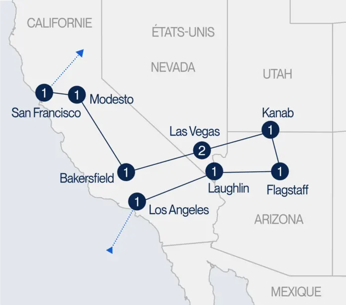 †Sur certains départs, la nuitée peut se faire dans la région de Fresno au lieu de Bakersfield.
