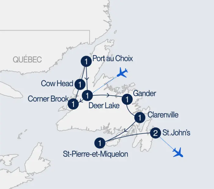 Rendez-vous à l’aéroport de Montréal pour prendre votre vol via Halifax à destination de Deer Lake sur l’île de Terre-Neuve. À votre arrivée, transfert vers Corner Brook. Tour d’orientation de la deuxième plus importante ville de la province. Installation à l’hôtel pour la nuit.