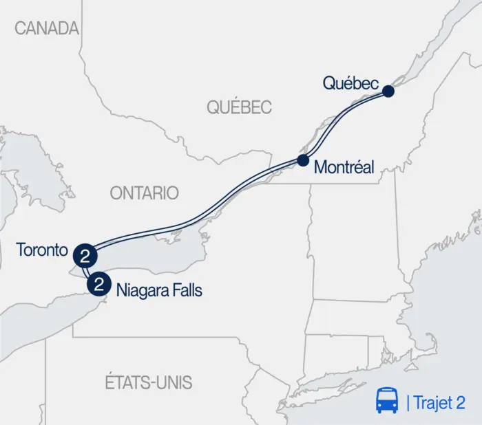 Départ vers Toronto, via Montréal. Dîner libre en route. Continuation vers Toronto. Installation à l’hôtel pour deux nuits. Souper libre sur place.