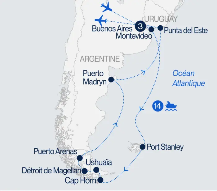 Découvrez les merveilles de l’Amérique du Sud et de la Patagonie lors d’une croisière exceptionnelle à bord du luxueux Celebrity Equinox. Après trois nuits dans la vibrante Buenos Aires, partez à la découverte de paysages spectaculaires et d’escales fascinantes telles que Montevideo, Ushuaïa, Punta Arenas et Puerto Madryn. Naviguez également jusqu’au mythique Cape Horn et aux îles Falkland à Port Stanley, avant de faire escale à l’élégante Punta del Este. Une aventure unique entre grandes villes, nature grandiose et navigation aux portes du bout du monde.