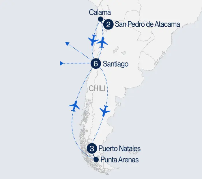 Départ pour Punta Arenas, porte d’entrée de l’Antarctique chilien (trajet de 3h). Visite des principaux sites : Cerro Mirador, place Muñoz Gamero, monument de Magellan. Dîner dans un restaurant local. Transfert à l’aéroport et vol vers Santiago. Accueil à l’arrivée et transfert à l’hôtel. (DJ, DN)