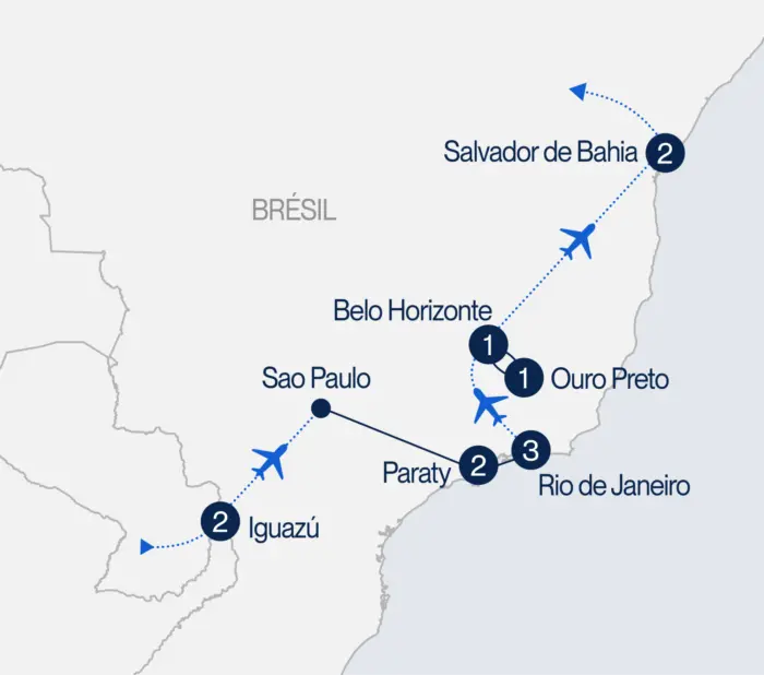 Transfert à l’aéroport de Belo Horizonte et vol vers Salvador de Bahia. À votre arrivée, accueil par votre guide local francophone. Visite de l’église «Nosso Senhor de Bonfim». Dîner au coeur d’une rue coloniale du Pelourinho. Départ pour la visite du quartier historique considéré comme l’un des plus beaux vestiges de l’histoire brésilienne. Dégustation d’une savoureuse crème glacée locale. Découverte de la ville haute et de la ville basse. Souper, puis spectacle avec démonstration de nombreuses danses. (DJ, DN, S)
