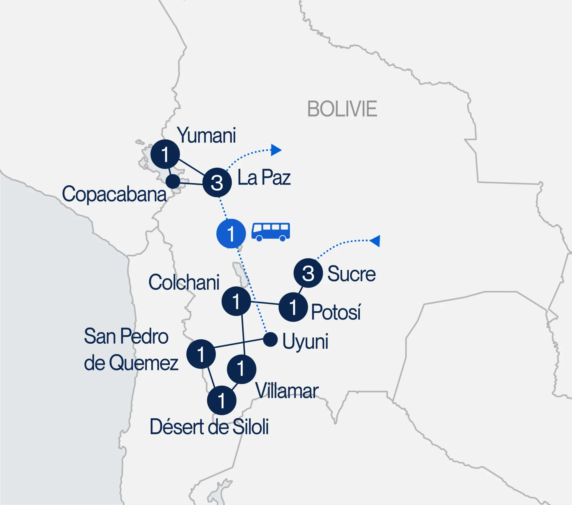 Départ à la découverte du plus grand désert de sel au monde : le salar d’Uyuni (3 650 m alt.). La sensation est unique : l’horizon n’a plus de limite et l’immensité invite au silence. Route sur cette immense étendue blanche pour atteindre l’île d’Incahuasi. Cette surprenante île d’origine volcanique, perdue en plein coeur du salar, offre un point de vue imprenable sur le désert de sel et les volcans environnants. Elle est recouverte de stromatolithes (premières tracesde vie sur Terre) et de cactus géants. L’après-midi, traversée du salar et cap à l’est vers la ville d’Uyuni. Arrêt pour visiter une exploitation de sel et l’unique hôtel de sel. Votre chauffeur vous déposera à la station d’autocar de Uyuni où vous prendrez le bus de nuit en direction de La Paz. Souper. (DJ, DN, S)