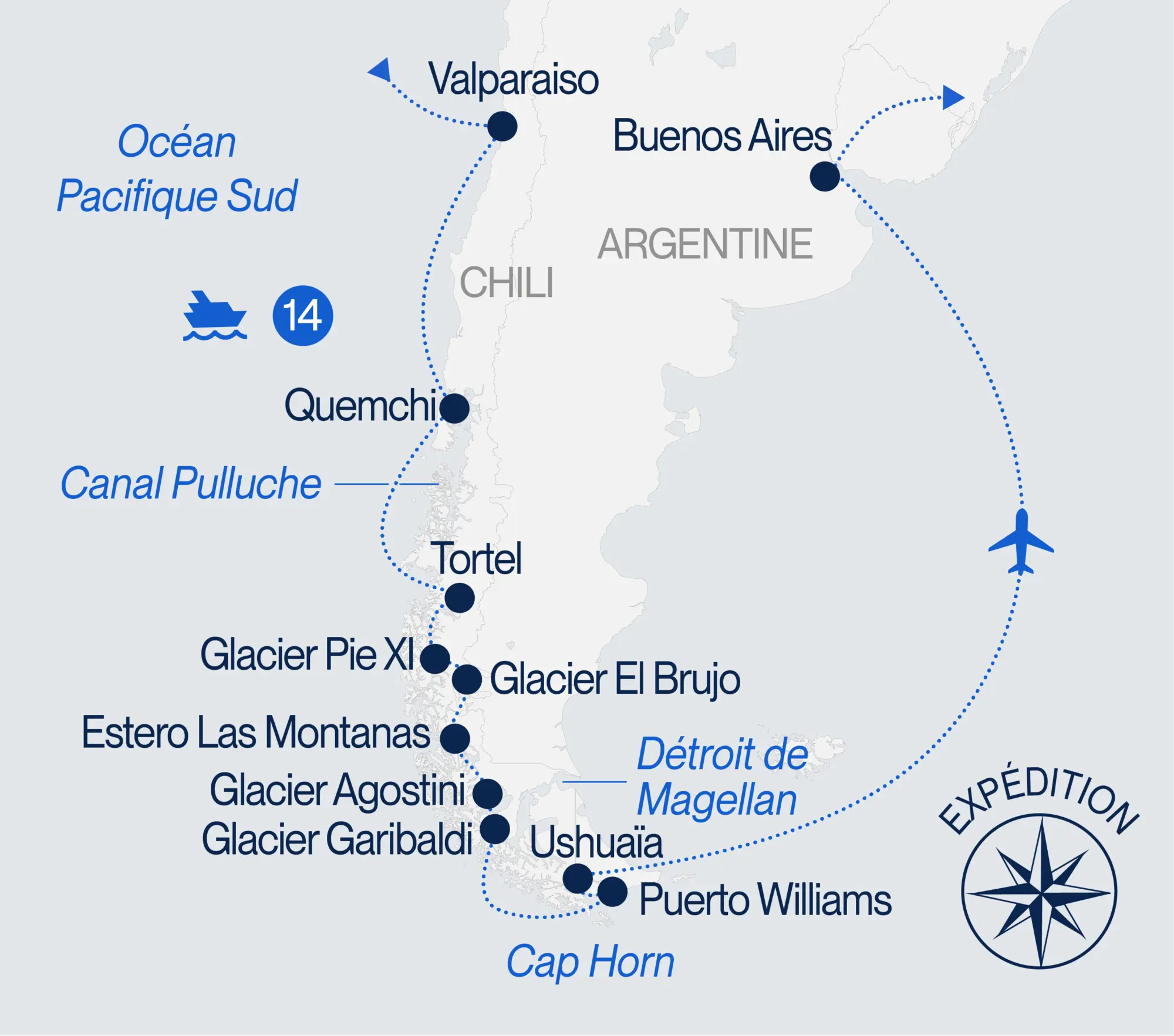 Mythique détroit situé au sud du Chili et séparant l’Amérique du Sud de la Terre de Feu, le détroit de Magellan éveille en chacun de nous l’imaginaire, l’envie d’aventure. Partez sur les traces du célèbre explorateur portugais Fernand de Magellan, connu pour être à l’origine de la première circumnavigation de l’histoire au XVIe siècle. À bord de votre navire, parcourez les 600 km qui séparent l’océan Atlantique du Pacifique et découvrez, avant de rejoindre les fjords chiliens et la péninsule Antarctique, celui que l’on a longtemps surnommé « le détroit de la Toussaint », en hommage à la date à laquelle il a été découvert. Une aventure fascinante s’offre à vous.