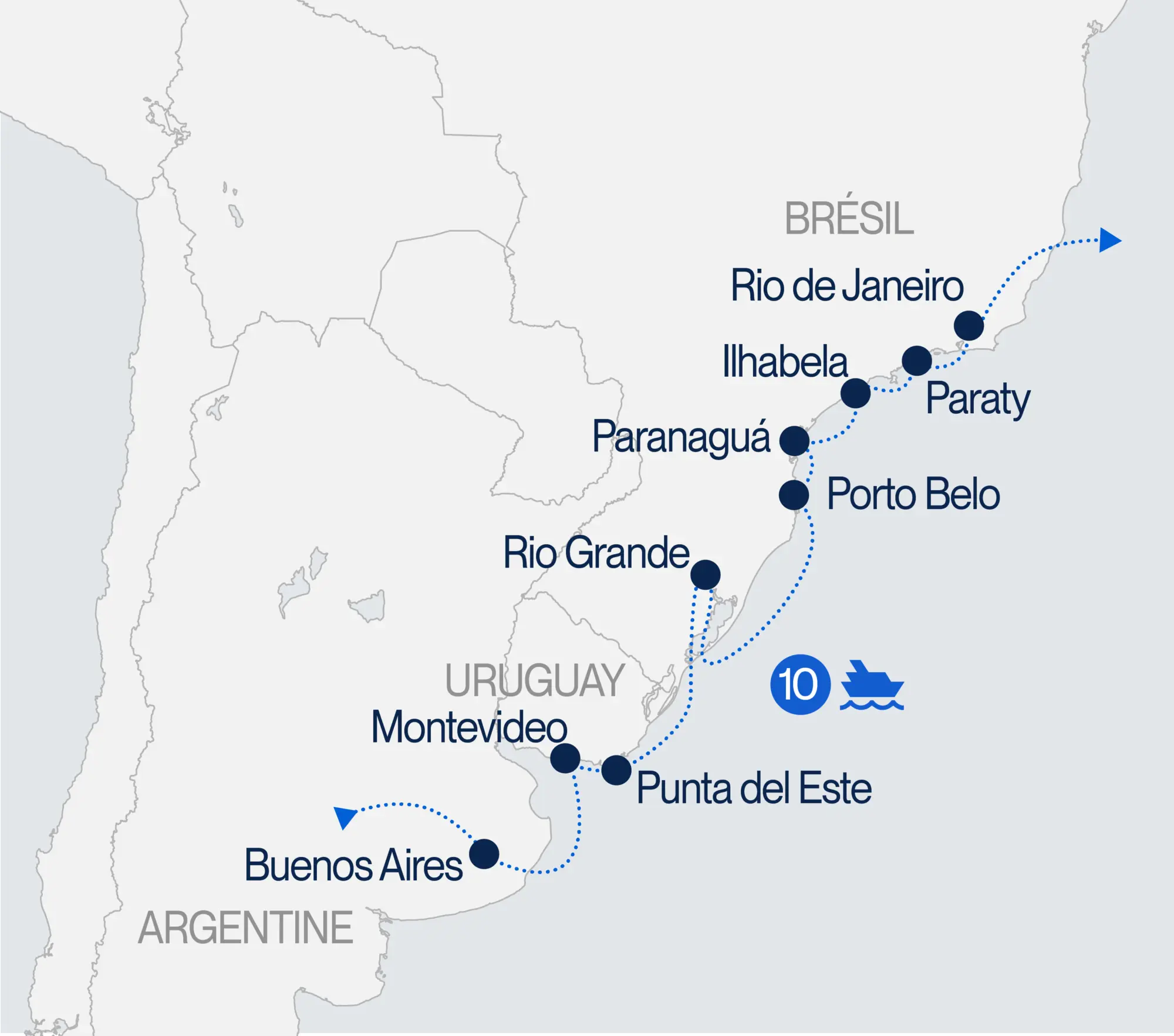 Imaginez-vous voguer entre Buenos Aires et Rio de Janeiro, porté par les flots de l’océan. À la fin de l’été austral, embarquez lors d’un voyage inédit où métropoles vibrantes se mêlent aux plages paradisiaques et aux paysages verdoyants. Laissez-vous captiver par des villes iconiques comme Montevideo, élégante et chaleureuse, Punta del Este, luxueuse et raffinée, Porto Belo, préservée et authentique ou encore Rio de Janeiro, vibrante et festive. Laissez aussi place à l’évasion dans des contrées paradisiaques comme Paraty, cité coloniale colorée nichée entre jungle et océan, ou Ilhabela, l’île aux nombreuses cascades où sérénité et beauté naturelle se rencontrent.