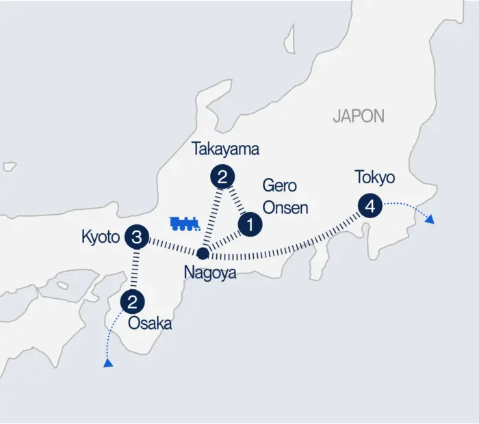 Matinée libre pour vous reposer ou profiter encore de Takayama à votre rythme. En fin de matinée, transfert à la gare pour prendre le train en direction de Gero Onsen. Cette charmante ville thermale vous accueille et vous offre une relaxation inédite. Laissez-vous tenter par les bains de pied, les bains communs, ou même le plus ancien bain de la ville, qui existe depuis 700 ans. Vous découvrirez également le marché matinal, le musée qui retrace l’histoire de la ville, ou bien les temples environnants. Dîner dans un restaurant local. Vous profiterez d’un moment de détente avant de prendre le chemin des rues animées de Gero Onsen. Nuit dans un hébergement typique japonais Ryokan. (DJ, DN)