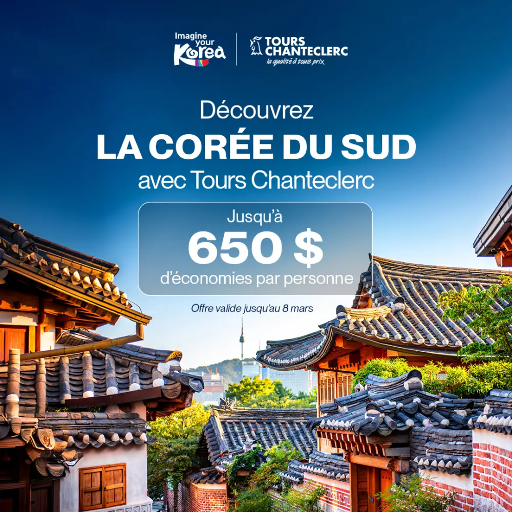 Réservez l'un de nos 3 circuits en Corée du Sud avant le 8 mars et économisez jusqu’à 1 300 $ par couple grâce à un rabais additionnel de 150 $ par personne, en plus des offres habituelles : réservez tôt et paiement comptant.