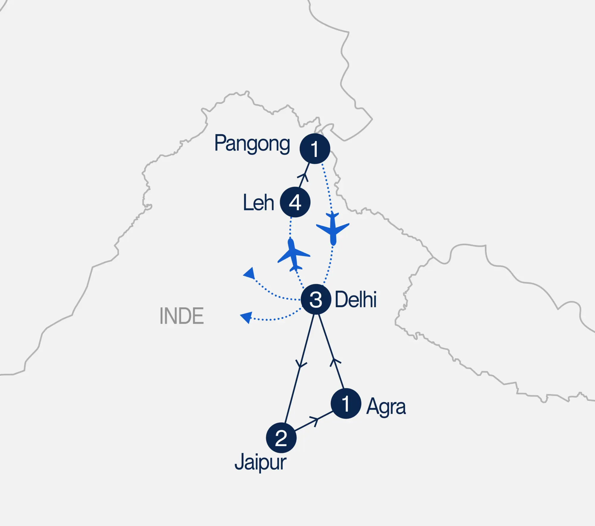 Matinée libre. Transfert vers l’aéroport de Leh et vol pour Delhi. Accueil à votre arrivée à l’aéroport et transfert à votre hôtel. Souper et nuit à l’hôtel. (DJ, S)