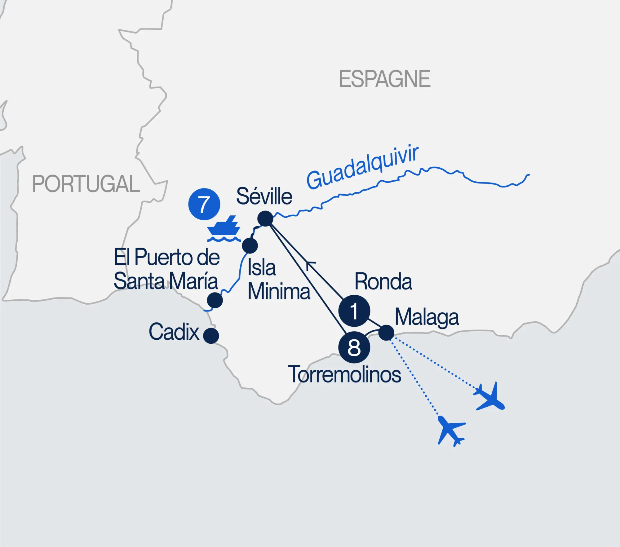 Partez à la découverte du riche passé de l’Andalousie. De Séville, où les cultures chrétienne et musulmane vécurent une stimulante cohabitation, à Jerez, berceau du flamenco et du célèbre vin de xérès, laissez-vous charmer par des lieux empreints d’histoire et de traditions. Vous explorerez également Setenil de las Bodegas, un village unique dont les maisons sont creusées à même la roche, et Ronda, dominée par son impressionnant pont qui enjambe un profond ravin, véritable symbole de la ville. Vous ne pourrez que tomber en amour avec cette région de l’Espagne Après votre croisière, vous pourrez profiter du soleil de la Costa del Sol avec un séjour à Torremolinos, la ville favorite de plusieurs Québécois. Un tour d’horizon de la culture andalouse agrémenté de dégustations de saveurs typiques vous attend !