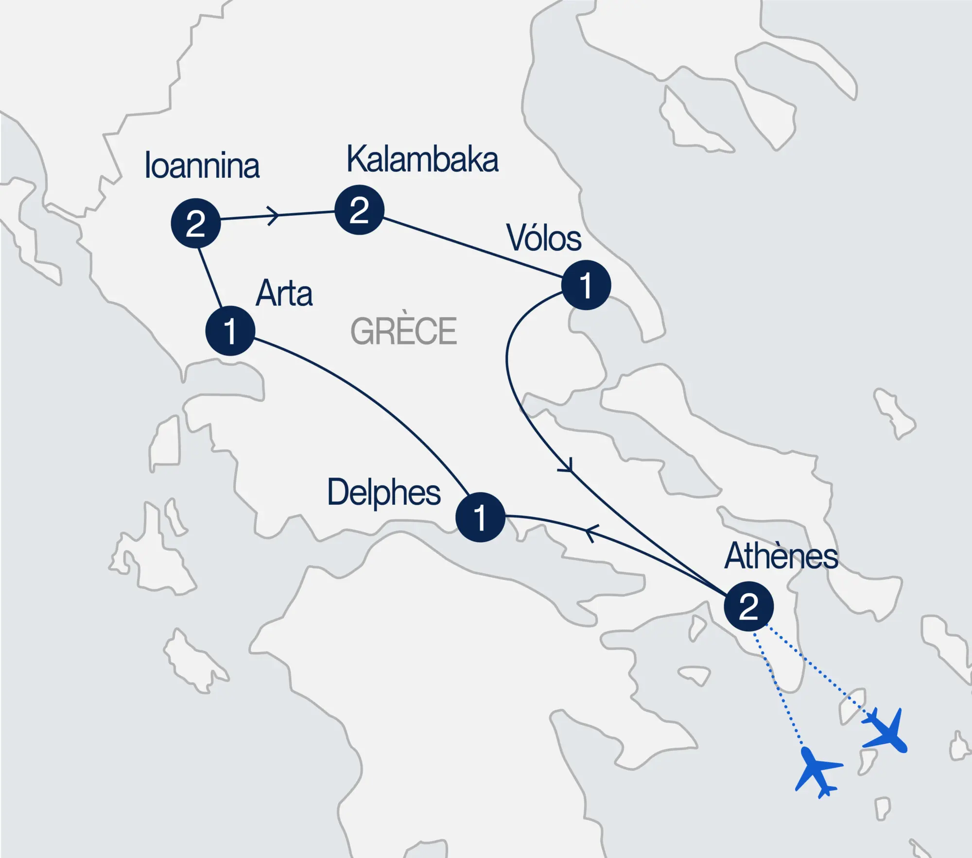 Ce matin, traversée du lac de Pamviotis puis découverte de l'île de Nissi suivie de la visite du monastère d'Agios Panteleimonas. Lunch libre et départ vers le site archéologique de Dodone dont ferez la visite. Poursuite vers le village de Metsovo, ancien comptoir français au 18e siècle, réputé pour ses fromages que vous dégusterez accompagné de Tsipouro, un alcool local. Continuation vers la région de Kalambaka, installation à votre hôtel et dîner. (PD/D)