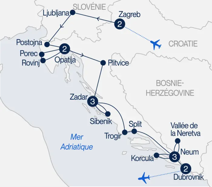 De Zagreb à Dubrovnik en passant par Ljubljana et Opatija, vous découvrirez tout le charme de la côte adriatique où ses nombreuses îles et îlots sauvages se marient avec un patrimoine culturel et historique inestimable. Des paysages montagneux de Slovénie aux plages de la côte, ce circuit vous montrera un tout autre visage de l’Europe.