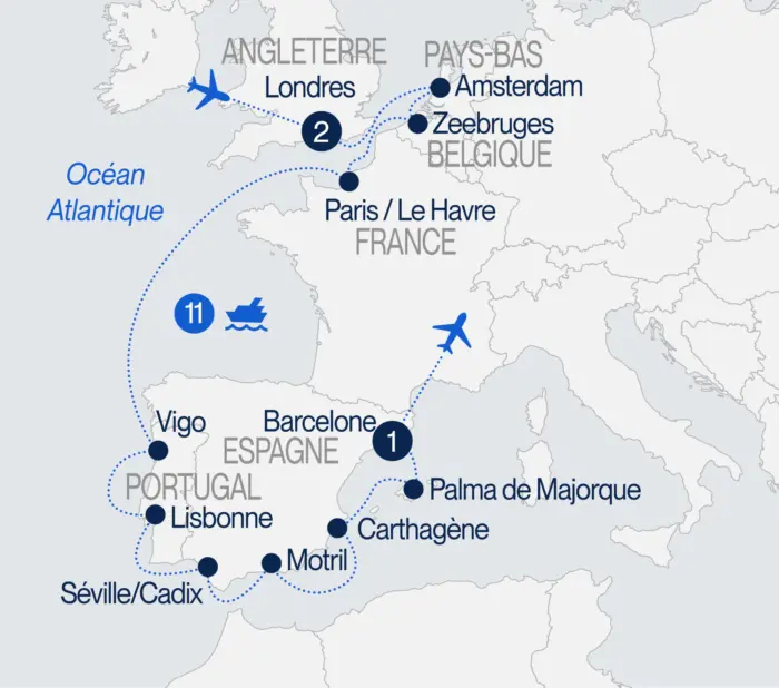 Avec un départ de Londres, laissez-vous séduire par un itinéraire d’exception alliant capitales emblématiques et joyaux côtiers de l’Europe de l’Ouest. De la vibrante Amsterdam à la romantique Lisbonne, en passant par les charmantes villes espagnoles baignées de soleil, chaque escale promet découvertes et émerveillement. Terminez ce voyage inoubliable à Barcelone, où art, culture et passion se rencontrent au rythme du flamenco.