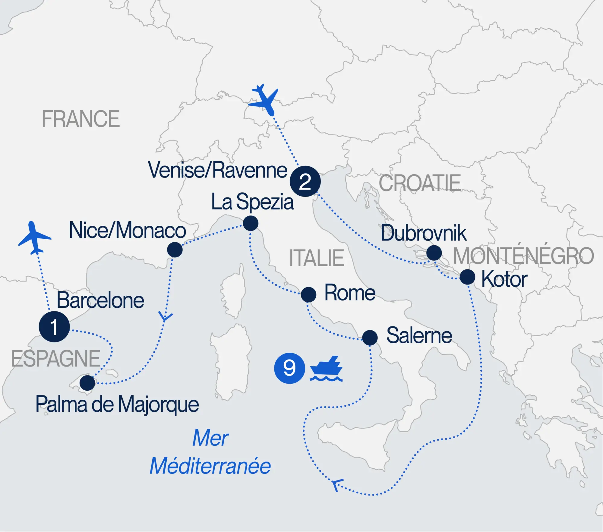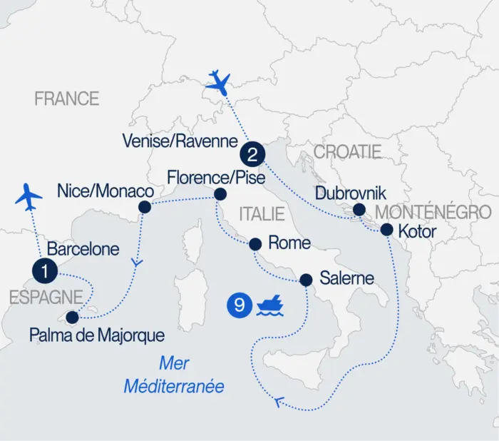 Embarquez pour une croisière inoubliable qui vous mènera de la romantique Venise, où chaque canal raconte une histoire, jusqu’à la vibrante Barcelone, capitale de la créativité et du soleil. Entre ces deux joyaux, laissez-vous séduire par la médiévale Dubrovnik, perle de l’Adriatique aux remparts légendaires, puis par la pittoresque Kotor, nichée dans l’un des plus beaux fjords du sud de l’Europe. L’aventure se poursuivra avec l’éternelle Rome, où l’histoire s’écrit à chaque coin de rue, et l’élégante Florence, berceau de l’art et de la Renaissance italienne. Enfin, terminez votre périple à Palma de Majorque, éclatante de lumière. Une croisière d’exception, entre mer turquoise, patrimoine fascinant et saveurs méditerranéennes!