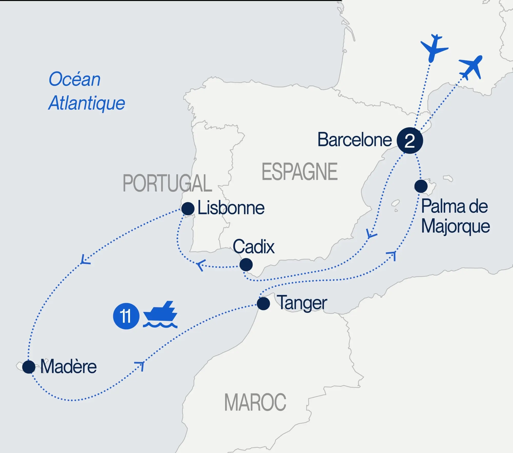 Embarquez à bord du tout nouveau Celebrity Xcel, véritable bijou de modernité et d’élégance, pour une croisière d’exception au coeur de la Méditerranée et de l’Atlantique. De la vibrante Barcelone aux charmes ensoleillés de Madère, en passant par les trésors culturels de Lisbonne et de Séville, chaque escale vous envoûtera. Un voyage raffiné alliant découvertes, détente et le luxe incomparable du dernier-né de la flotte Celebrity Cruises.