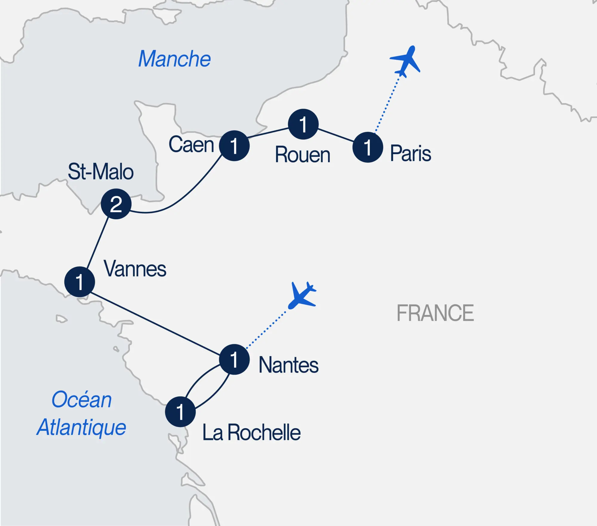 Patrie de Champlain et de Cartier, terre d’émigration vers l’Amérique. Découvrez la Bretagne et ses toits de chaume avant d’atteindre Paris, la ville côtes escarpées, la Normandie et ses lumière aux attraits si nombreux.