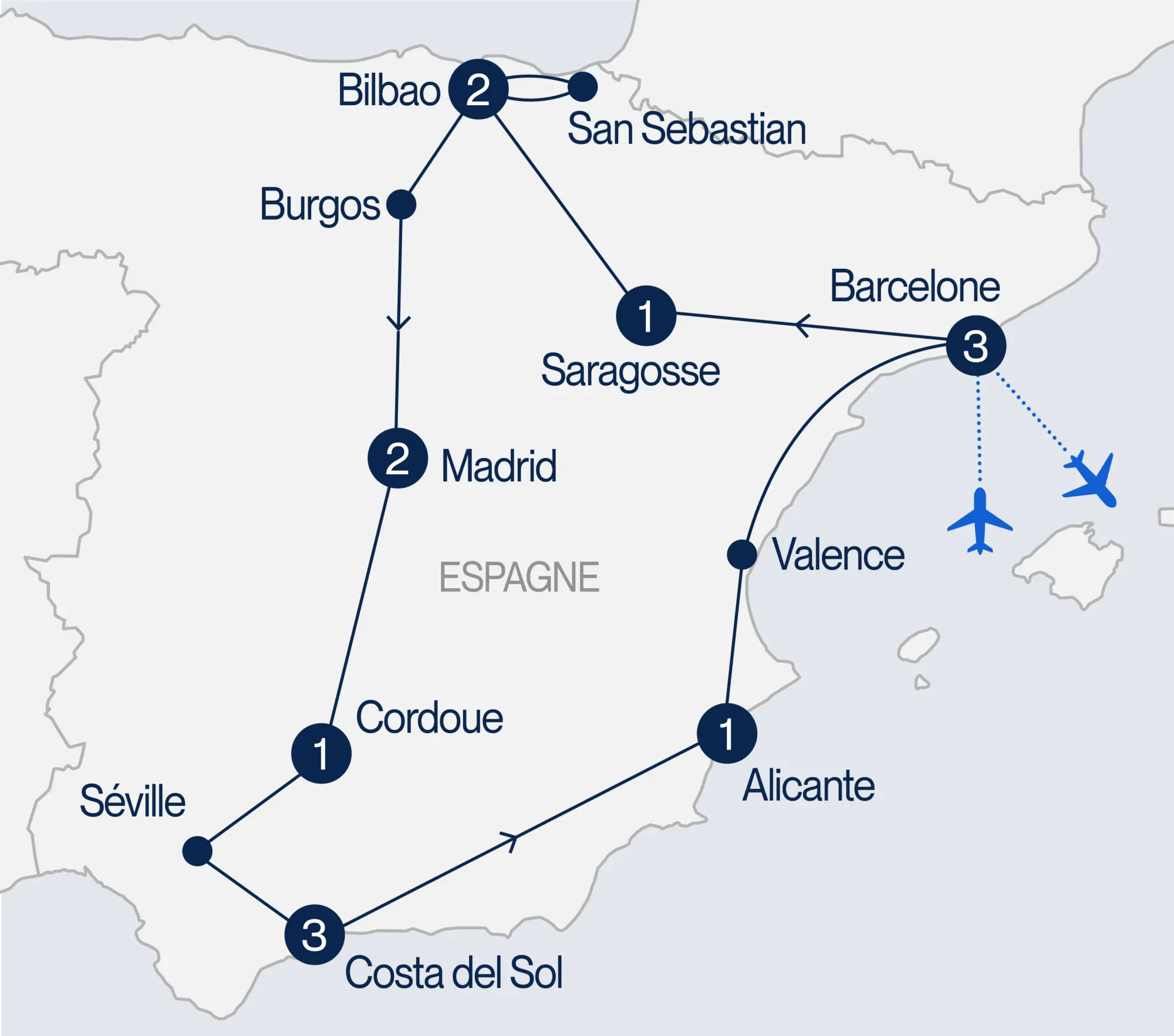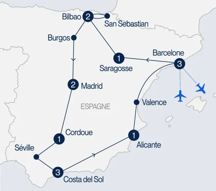 Visitez les quatre coins de l’Espagne grâce à cet itinéraire. Contemplez son patrimoine exceptionnel et ses paysages sublimes; des montagnes spectaculaires, de grandes terres fertiles et de magnifiques vignobles. Finalement, découvrez ses traditions séculaires et savourez sa gastronomie au cours d’un voyage qui vous présentera l’Espagne dans toute sa splendeur.