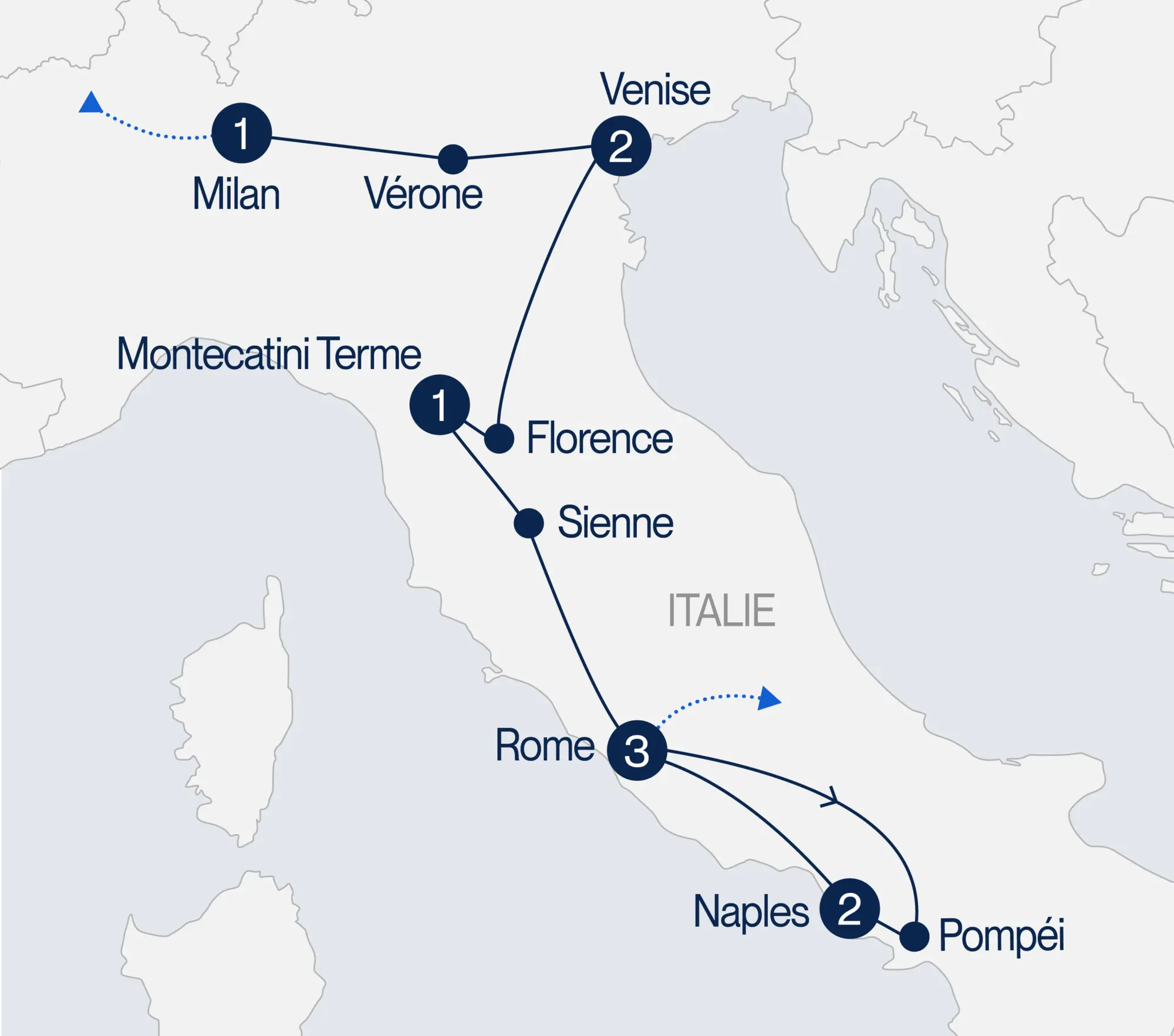 De Venise à Rome via Vérone, Florence, Sienne, Naples et Pompéi ce sont toutes les plus belles villes italiennes chargées d’histoire et à l’héritage architectural sans pareil, classées par l’UNESCO, qui se succèdent dans ce très bel itinéraire.