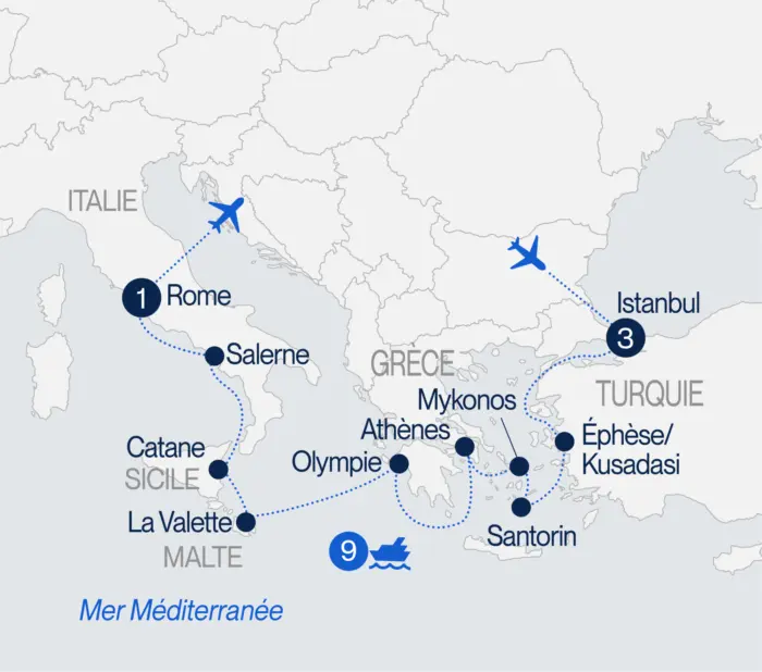 Embarquez à bord du Norwegian Viva pour une croisière exceptionnelle mêlant culture, détente et paysages à couper le souffle. Après trois nuits à Istanbul, découvrez les merveilles d’Éphèse, les charmes des îles grecques de Santorin et Mykonos avant de poursuivre vers Athènes, Olympie, La Valette, Catane et la Côte Amalfitaine. Terminez ce voyage inoubliable avec une nuit magique à Rome, la Ville Éternelle. Une aventure où chaque escale raconte une nouvelle histoire !