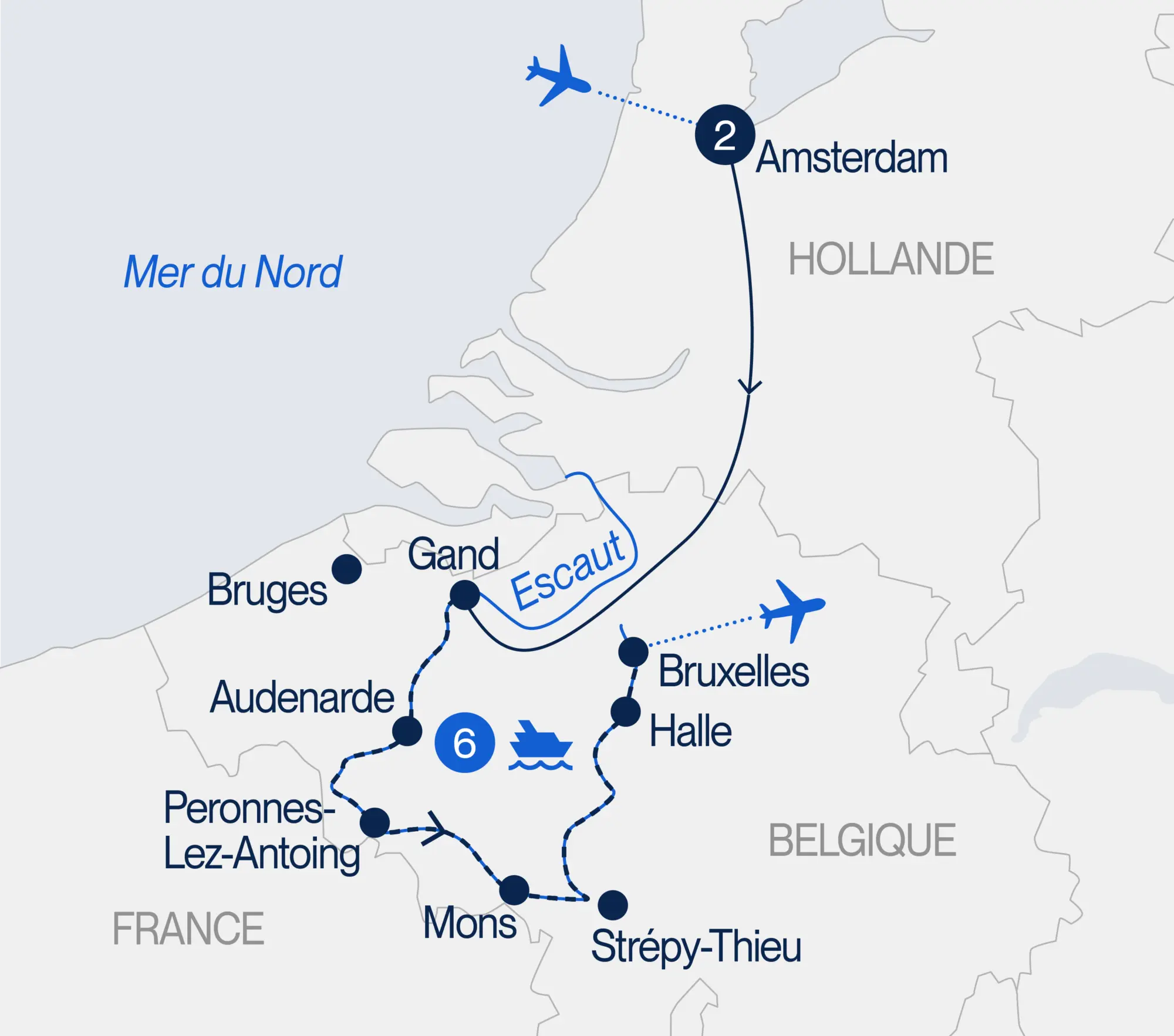 La Belgique possède un réseau dense de voies navigables traversant la Flandre et la Wallonie d'est en ouest et du nord au sud. Laissez-vous séduire par cette croisière qui offre au fil de l’eau un large panel tant architectural que gustatif. Grâce à ses grandes richesses culturelles concentrées le long des canaux, vous découvrirez des villes emblématiques, des sites hauts en couleur et des saveurs que seule la Belgique offre. Ainsi, vous pourrez déguster des spécialités locales : chocolat, bière, vin et autres douceurs ; découvrir Gand, Bruges, Audenarde, Mons et Bruxelles ou encore le château Beloeil surnommé le « Versailles belge », et le domaine Chant d’Éole, un vignoble dont les cuvées ont été plusieurs fois primées.