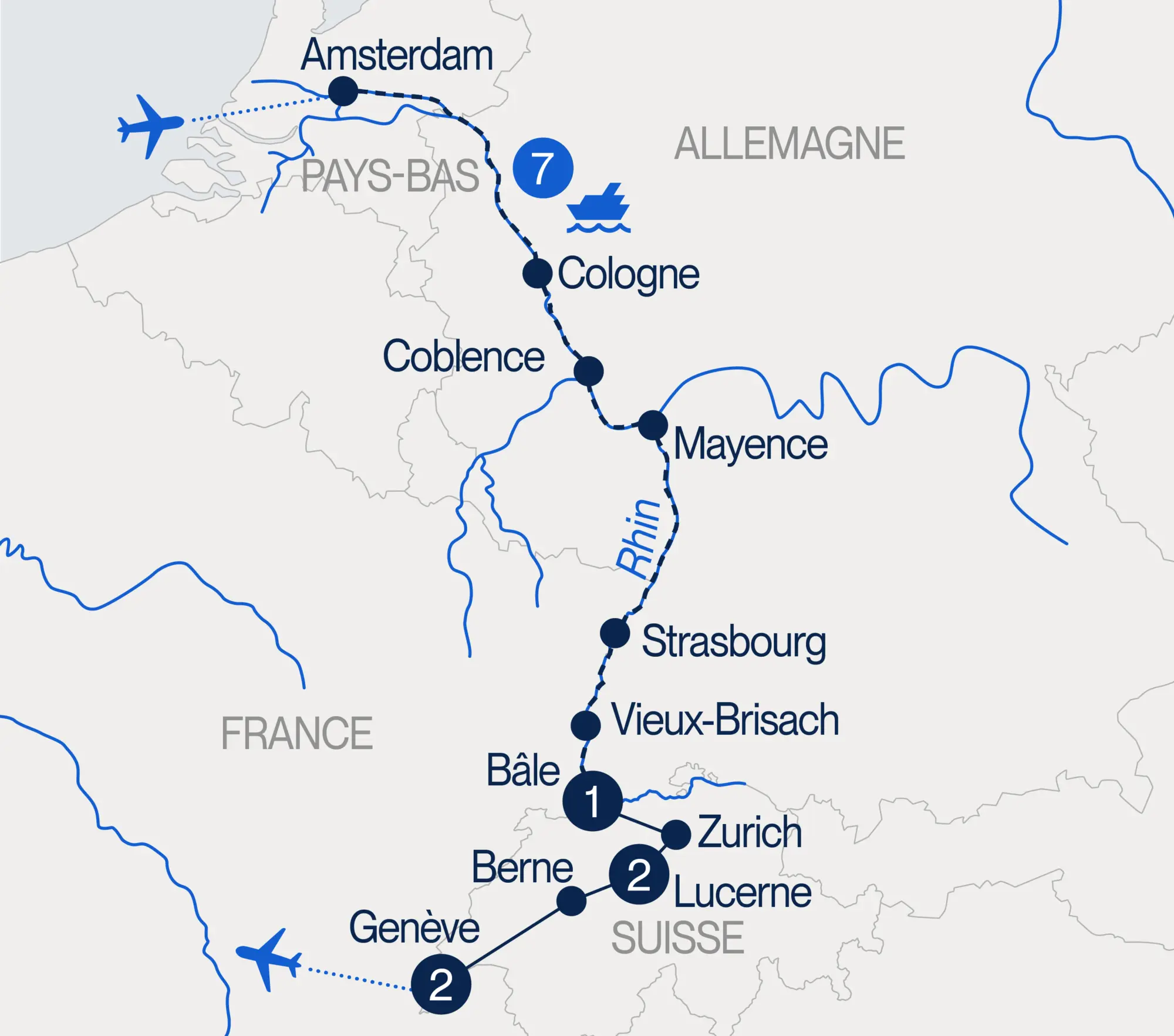 Débarquement. Rencontre avec votre guide francophone et visite de la vieille ville de Bâle. Départ vers Zurich, métropole suisse animée au bord du lac de Zurich. Temps libre pour le lunch puis visite guidée à pied de la vieille ville. Vous parcourrez les ruelles étroites pour découvrir de jolies maisons médiévales, la cathédrale, le Grossmünster, emblème de la ville, l’église Fraumünster, connue pour ses vitraux de Chagall et Giacometti et la Bahnhofstrasse, l’artère la plus animée de la ville avec ses magasins de luxe, ses grandes banques et ses immeubles classiques et modernes. Installation à votre hôtel et soirée libre. (PD)