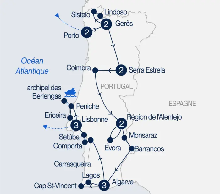 Voyagez à travers la « Toscane portugaise », un joyau caché de campagne luxuriante, parsemé de charmants villages, de collines ondulantes et de vignobles ensoleillés. Depuis le village de Peniche, embarquez pour une balade en bateau vers l'archipel des Berlengas, une réserve de biosphère de l'UNESCO. Explorez le fort de São João Baptista, du XVIe siècle qui veille sur les eaux turquoise, et découvrez les magnifiques grottes marines qui font de cet archipel l'un des trésors écologiques les plus fascinants du Portugal. De retour à Peniche, longez l'Atlantique, et prenez un lunch avant de rejoindre Ericeira, une des seules réserves mondiales de surf en Europe avec des vues imprenables sur l'océan.Ce circuit se conclura par un souper d'adieu dans un restaurant 2 étoiles Michelin, pour une expérience gastronomique inoubliable. PETIT-DÉJEUNER, LUNCH ET SOUPER