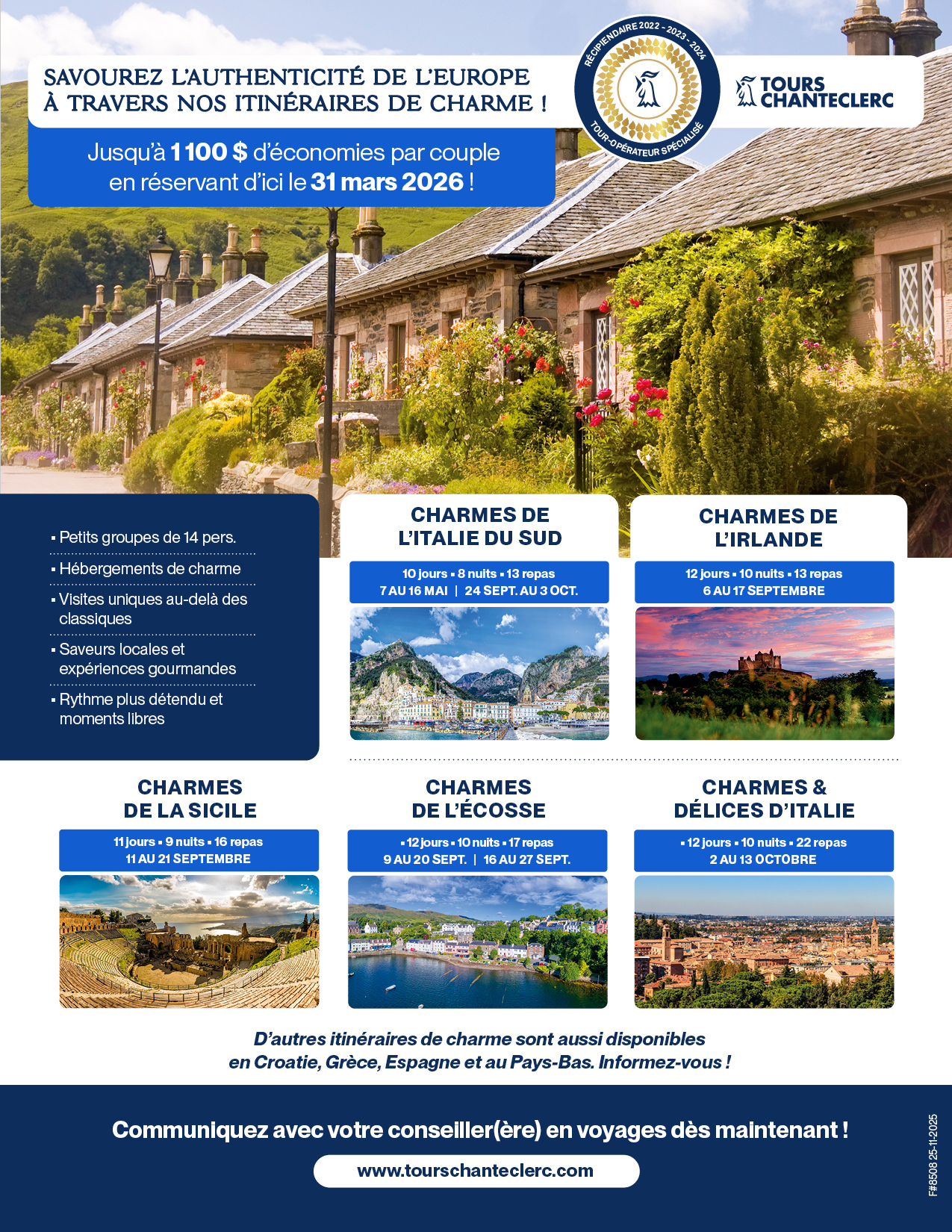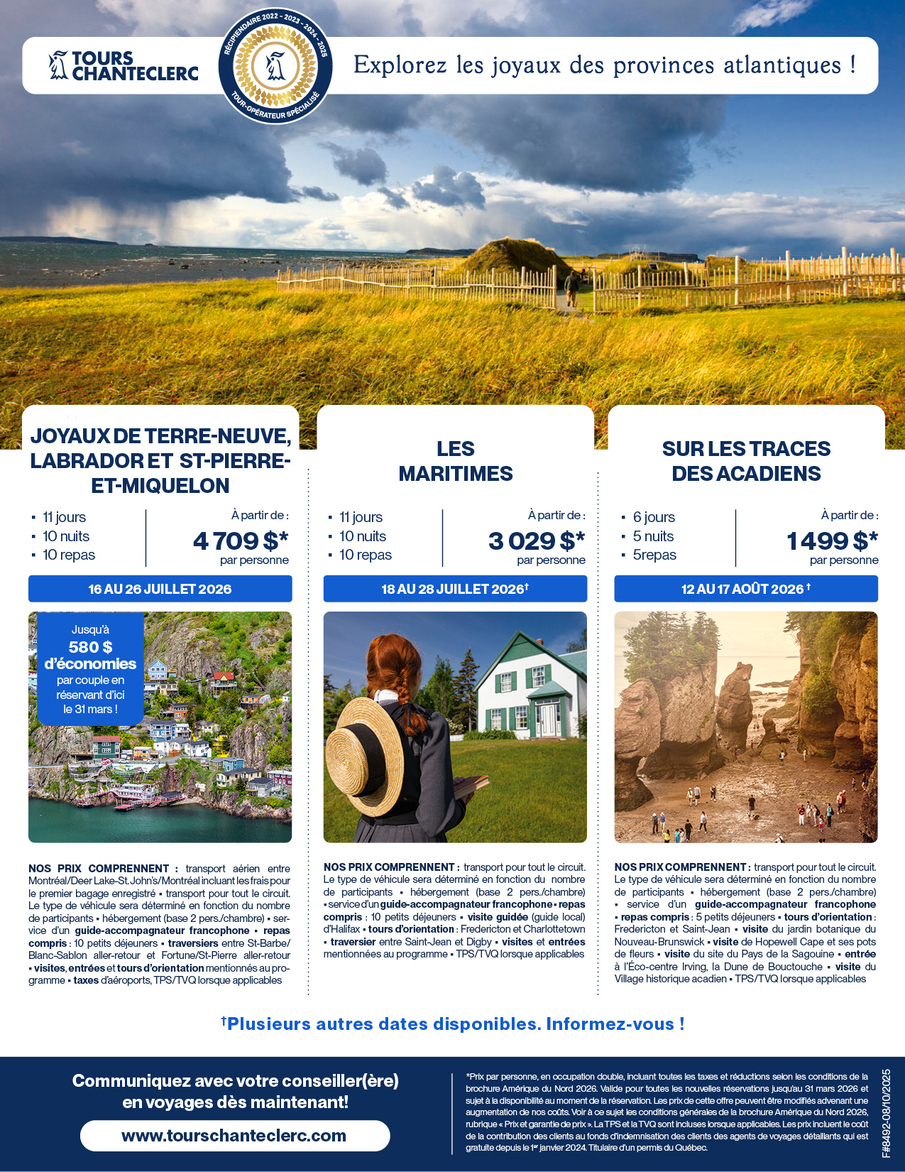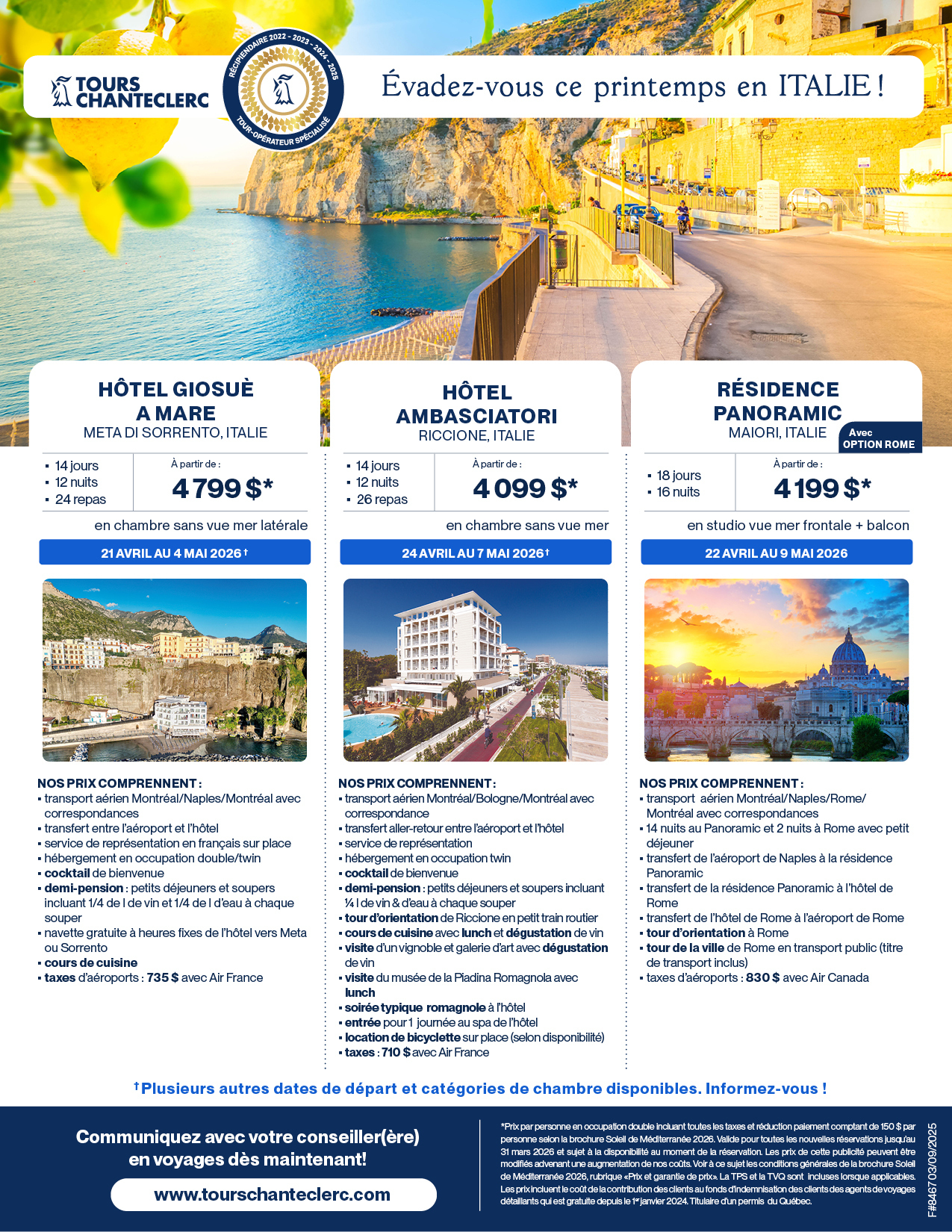 Découvrez nos produits pour 2026 à travers des webinaires animés par nos représentants, Josée Rouleau et Sylvain Ouellet ! Webinaires disponibles : Soleil de Méditerranée, Circuits en Europe et Îles de rêve.
